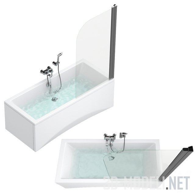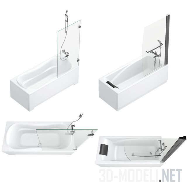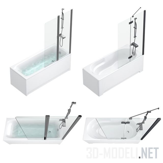 Несколько моделей шторок от Villeroy & Boch из стекла, монтируемых на борт прямоугольной ванны. Одинарные и с двойным стеклом (стационарной панелью и створкой). Со шторками представлены следующие ванны: Ravak CAMPANULA II (180х80см); Roca BeCool; Cersanit INTRO; Ideal ACTIVE (170х70см); Sanitana Helena (170х70см). К ваннам прилагаются душевые системы, панели и смесители.