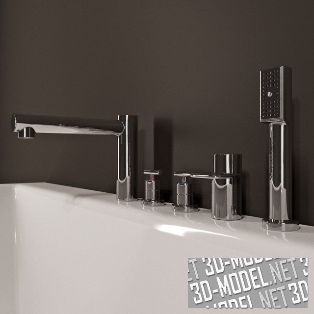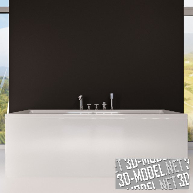 Современная белая акриловая прямоугольная ванна PRO 232951 от LAUFEN с врезанным в бортик смесителем art.:3223250042821 на пять позиций (излив, горячая, холодная, переключатель на душ, порт для лейки на гибком шланге). Габарит ванны: 180х80х62см. Передний экран, закрывающий видимую боковую плоскость - сплошной, без рельефов.