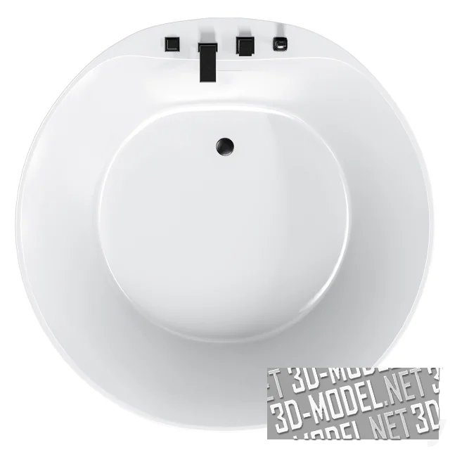 Современная отдельностоящая круглая ванна из белого акрила - AB9280 от ABBER. с черным смесителем из четырех посадочных элементов (ручка регулировки температуры воды, излив, переключение на душ и душевая лейка на гибком скрытом шланге). Борта ванны (h56см), постепенно расширяются кверху, увеличивая диаметр верхней кромки чаши до 150см.