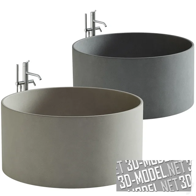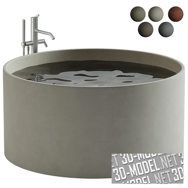 Современная круглая ванна из искусственного камня, модель In-Out CEMENTO. Толстостенная цилиндрическая чаша ванной (d130/h58см) представлена в пяти вариантах цвета (бледно-оливковый, светло-серый, серый, терракотовый, умбра. Композитный материал Exmar матовой текстурой напоминает бетон, штукатурку или камень. Размер напольного хромированного смесителя с небольшой душевой лейкой на гибком шланге - 22х82см.