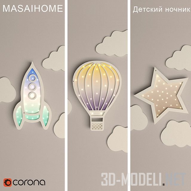 Три детских ночника Masaihome TOUCHLIGHT, яркой раскраски и с игривым дизайном. В наборе «Звезда» размером 31 х 31 х 6 см, «Воздушный шар» размером 35 х 24 х 6 см, «Ракета» размером 34 х 20 см, декоративное облако. Состав: мебельная древесная плита, светодиодные лампочки, безопасные краски на водной основе, рекомендованные для детских помещений.
