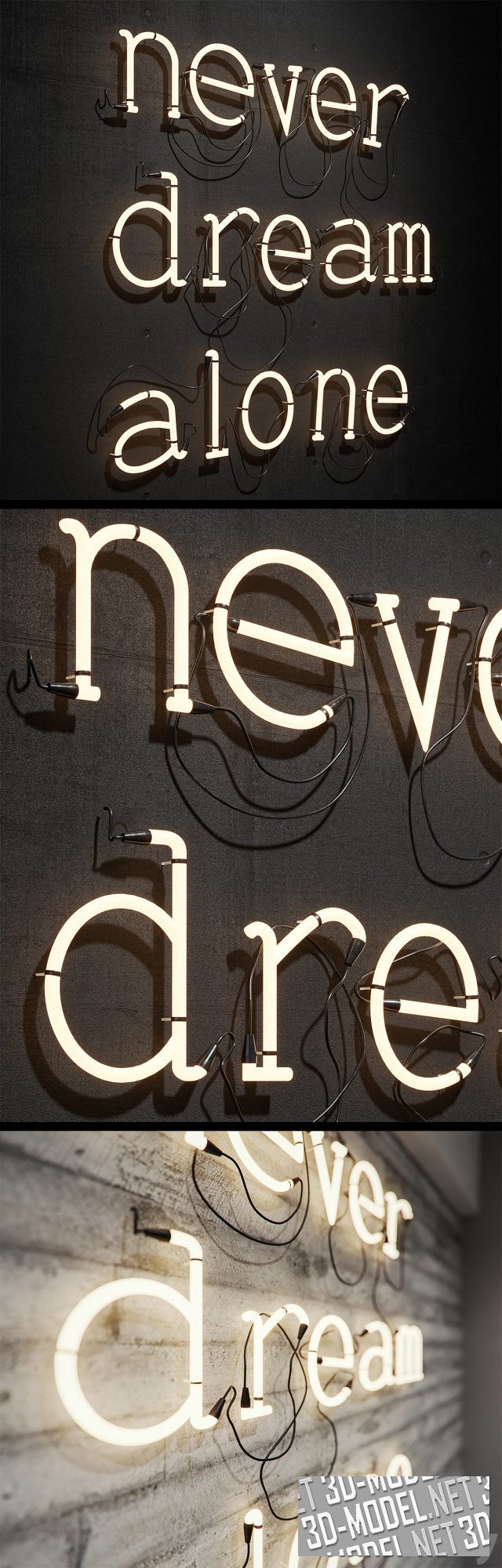 Never Dream Alone - отличный слоган и способ украсить пространство кафе, ресторана, магазина, комнаты подростка и других помещений. Надпись сделана с помощью неона. 3d-модель с настроенными материалами Corona и текстурами.