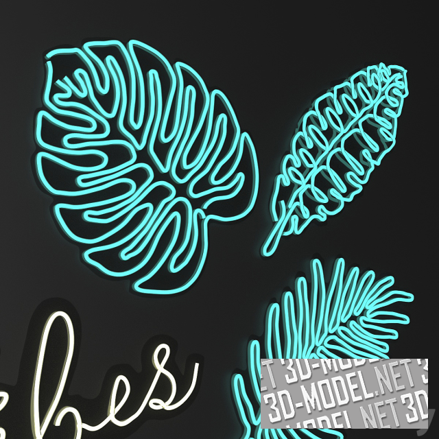 Набор с элементами неоновой световой рекламы. В наборе: белая надпись прописными буквами латиницей: «good wibes» и три стилизованных листа (монстеры, пальмы и банана). Листья представлены в разных цветах: флуорисцентные мятный, бирюзовый, маджента и желтый.