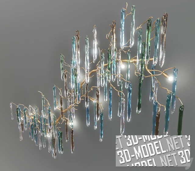 Современный настенный светильник 1447-14 от SERIP organic lighting. Выполнен в виде изогнутой ветки или корня из золотистого металла, природной диагональю размещаемой на стене. На кончиках «отростков» продолговатые кристаллы из стекла ручной работы, напоминающие сосульки. В прозрачную основу стекла подмешаны коричневые, голубые и зеленые оттенки. Несколько мелких лампочек, «затерявшихся» среди кристаллов, создают красивую игру свето-тени. Габарит бра: 235х170х30см.
