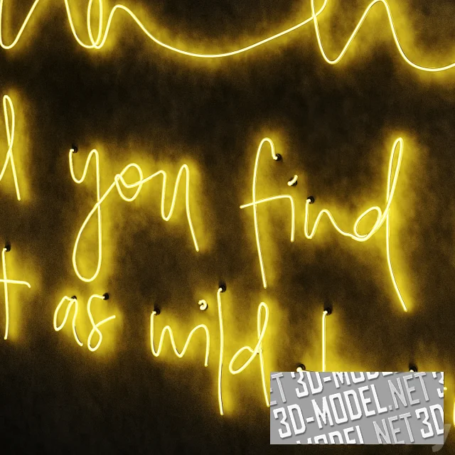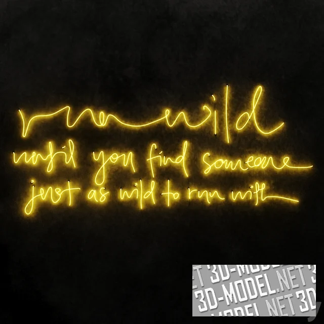 Украсить интерьер прихожей или подростковолй комнаты, а также кафе, клуба, салона и пр. можно с помощью такого светового элемента, как неоновая вывеска. Надпись может быть разных цветов (интенсивность и цвет лампы легко изменить в настройках материала) и содержания. Здесь предложен вариант «Run wild until you find someone».