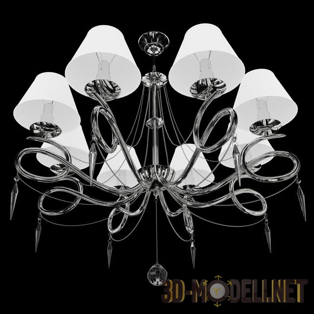 Большая восьмиламповая хромированная с белыми абажурами люстра в классическом стиле. Модель Freya FR2909-PL-08-CH Haley. На центральной оси расположились восемь консолей, завитых в петли, создавая красивый декоративный эффект. К каждой консоли прикреплён хрустальный подвес в виде заострённого кристалла. К центральной стойке с хрустальной чашкой подвешен гранёный шар. Плафоны классические, сужающийся кверху цилиндр, из белой ткани на проволочном каркасе. От каждого плафона тянутся к центральной стойке две декоративные нити, создавая ажурный силуэт.