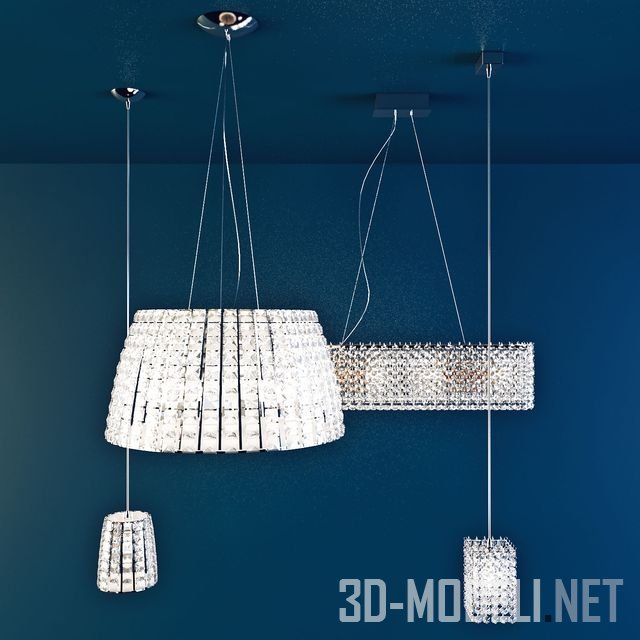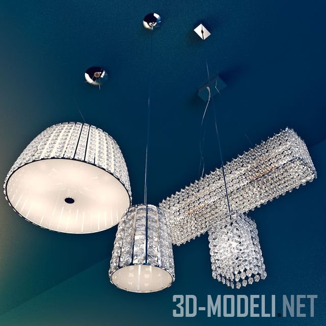 Набор люстр и подвесов с кристаллами. Светильники относятся к среднему ценовому сегменту. В комплекте люстры круглой формы, серии Odeon Nelsa от производителя Odeon Light (диаметр 160 и 510 мм), прямоугольная от шведского бренда Markslojd, серия Markslojd Trollenas (730 х 140 мм) и квадратная подвесная люстра Lightstar Cristallo, размером 100 х 100 см.