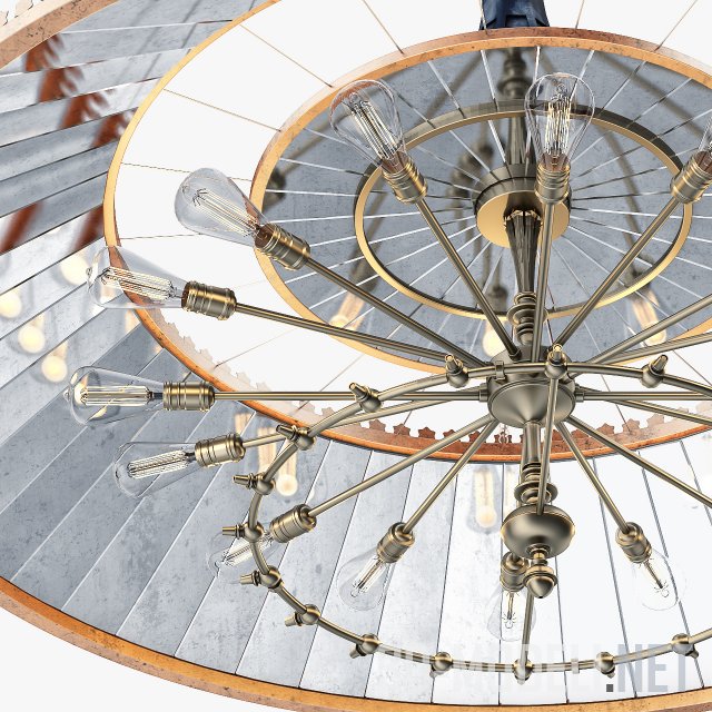 Винтажный светильник XIX в. Wheeler Mirrored Lamp. Внутренняя поверхность плафона выложена полосками зеркала. Наружная поверхность абажура из металлического листа декорирована золотистой кромкой. Шестнадцать ламп закреплены на лучеподобных кронштейнах, расходящихся от центральной литой колонны подвеса. Дополнительно люстра декорирована снизу золотистым обручем с шаровидными элементами.