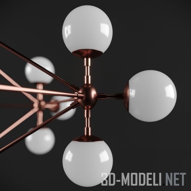 Крупный подвесной светильник на 21-у лампу, модель Modo Chandelier 21 Globe. Дизайнер Jason Miller. Производство Roll & Hill. Корпус светильника выполнен из бронзовых трубок, собранных в сложную конструкцию. Плафоны шарообразные, из белого стекла.
