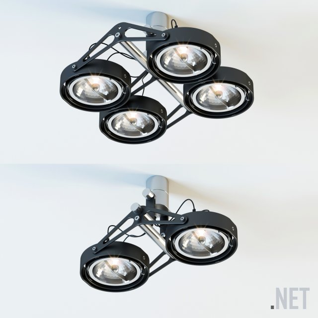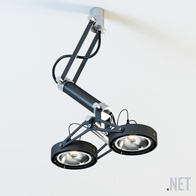 Современный модульный светильник Nomad в стиле хай-тек. Представлены варианты с четырьмя и двумя лампами. Особенность светильника - коленчатый кронштейн с хромированной трубкой. Корпуса светильников выполнены в виде невысоких черных цилиндров со скобой крепления.