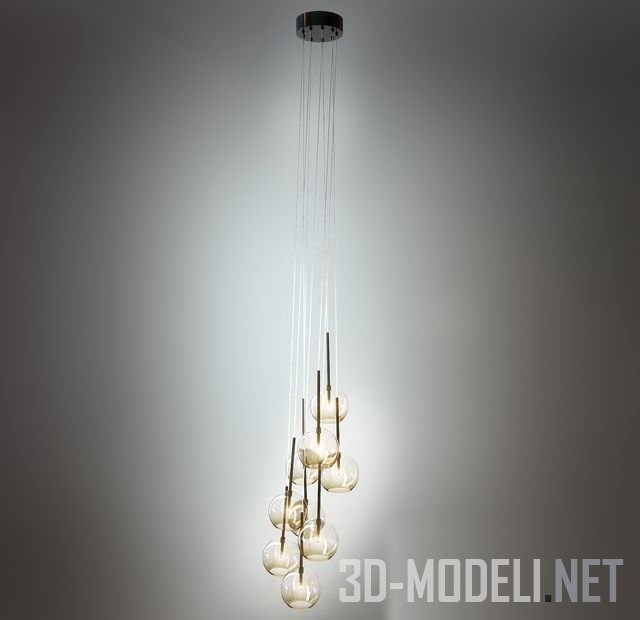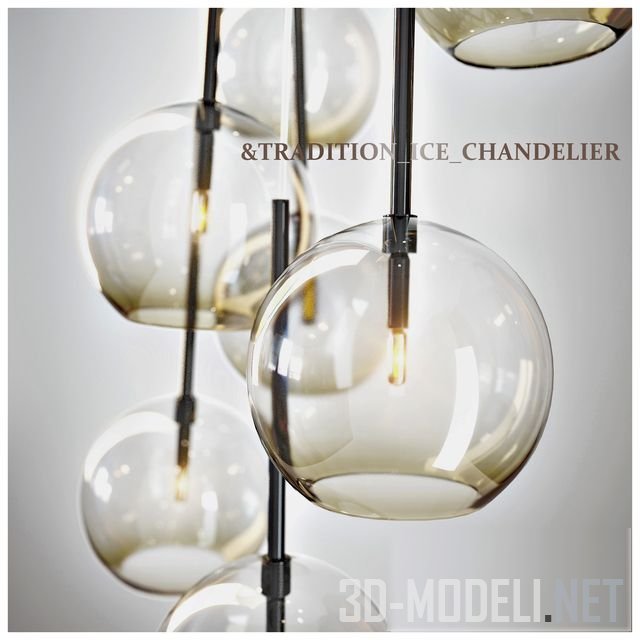 Современная люстра на девять ламп, модель Ice от бренда &Tradition. Ее дизайн можно отнести к стеклянным и хрустальным люстрам прошлого, но этот вариант полностью современный. Галогенные светильники окружены прозрачными и ничем не украшенными выдувными стеклянными шарами, каждый из которых уникален по своему характеру.