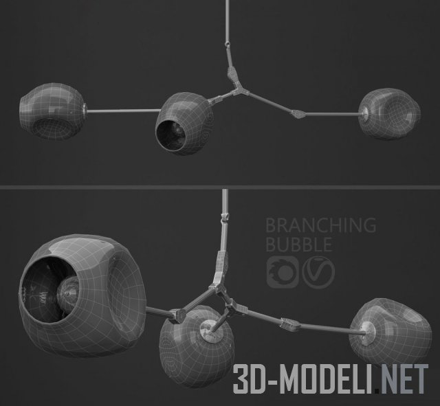 Оригинальный современный потолочный светильник с тремя пузыреобразными плафонами из прозрачного стекла. Основание светильника выполнено из латунной трубки, отрезки которой соединены «суставами», производя ощущение ветки дерева. На концах «веток» разместились лампы в патронах. Изначально шарообразные прозрачные плафоны в процессе изготовления были деформированы, бока их вмяты, что создает дополнительный декоративный эффект.