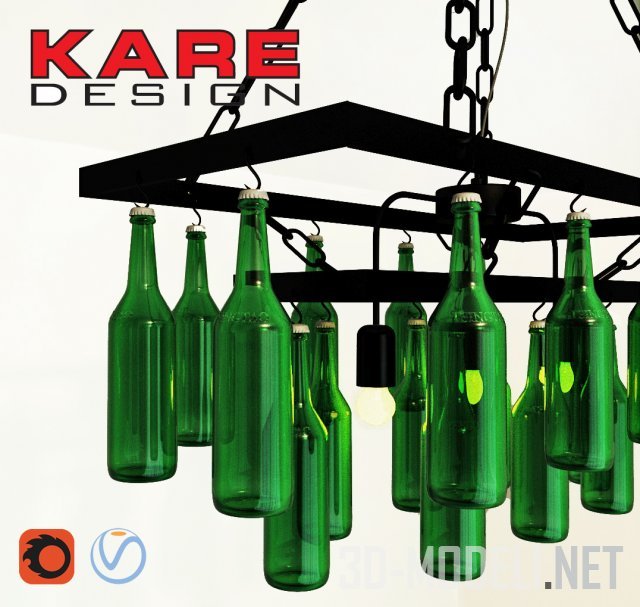 Двухъярусная люстра из пивных бутылок зеленого стекла, от бренда Kare design. Основанием люстры служит черная рама, подвешенная на цепях. Пивные бутылки висят на небольших крюках, воткнутых в пробки. Три лампы в патронах размещены в середине светильника.