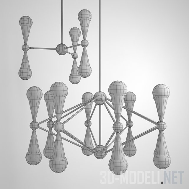 Две люстры Caracas от Jonathan Adler, 21330 CARACAS 16-LIGHT (965.2 х 571.5 мм) и 21547 CARACAS 6-LIGHT (863.6 х 863.6 мм). Дизайн предлагает кинетический модернизм, где простые геометрические формы, конусы и сферы, сталкиваются с динамическими результатами.