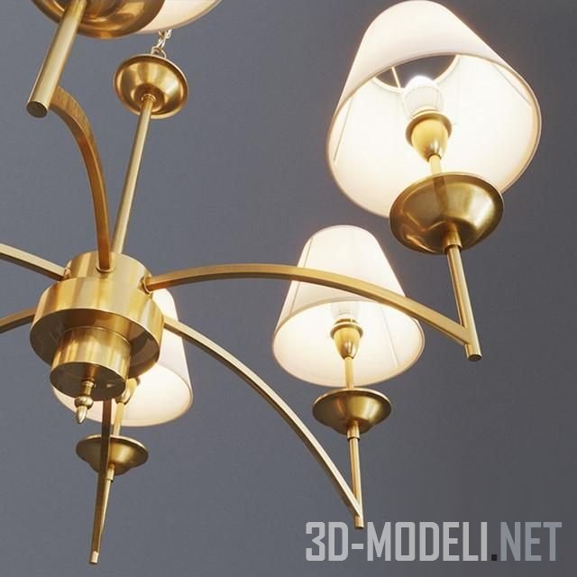 Современная люстра от китайского бренда Mel house. На латунных держателях, расходящимися лучами от центральной плашки, закреплены шесть плафонов. Плафоны конусообразной формы и белого цвета. Размеры люстры: ширина 68 см, высота 40 см.