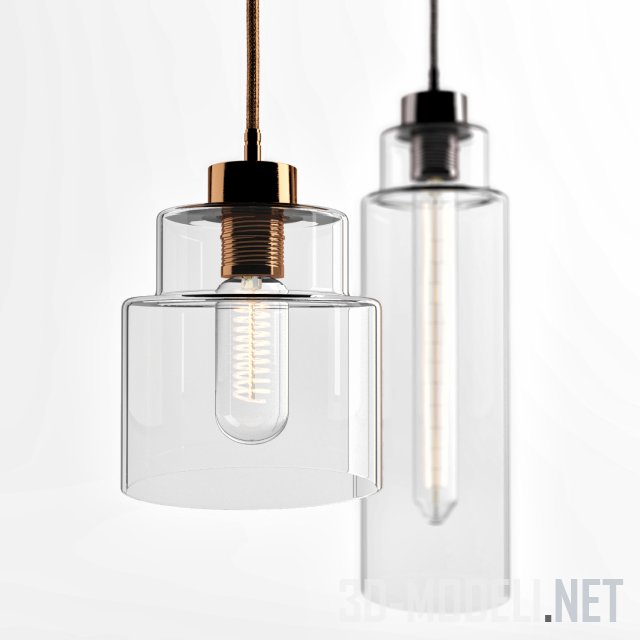Современные потолочные светильники Rothschild & Bickers Empire. Подвесы двух типов, с прозрачными стеклянными плафонами цилиндрической формы и металлическими фитингами из меди и цинка. Светильники висят на плетеном металлическом гибком кабеле.