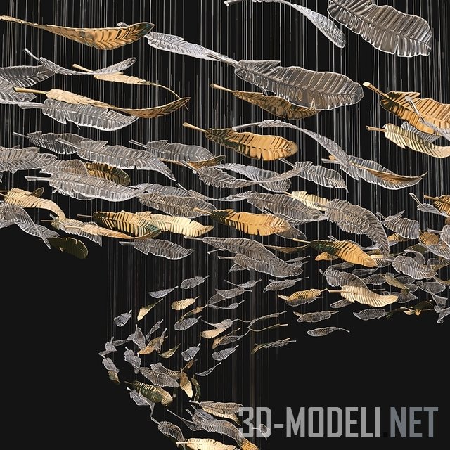 Потолочный современный светильник Airy. Люстра выполнена в виде летящих перышек из серебристого и золотистого металла. Все элементы подвешены на тонких нитях, что создает дополнительный эффект в восприятии светильника.
