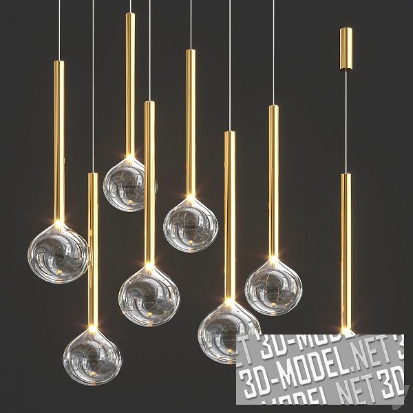 Современный подвесной светильник Sofi от Bonaldo в виде тонких золотистых трубок на тонком шнуре, с крупной «каплей» плафона из прозрачного стекла. Производитель предлагает светильники на 1, 5 и семь плафонов. В «связке» плафоны подвешены на разном уровне, что дает гармоничную группу.