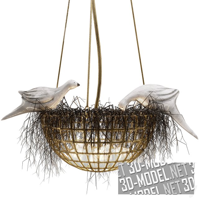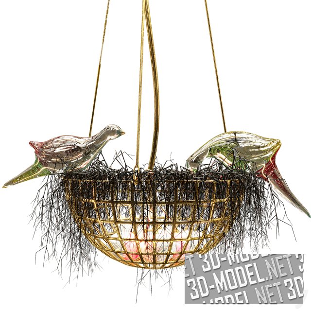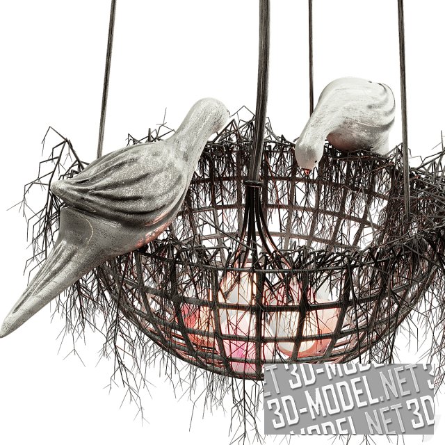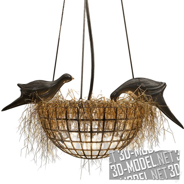Вариаций на тему гнезда в дизайне осветительных приборов немало, и каждый из них привлекателен по своему. Этот подвесной светильник имеет плетеную конструкцию, имитирующую плетеное из веток гнездо. Гнездо-абажур, как и птицы, предлагаются в различных вариантах отделки.