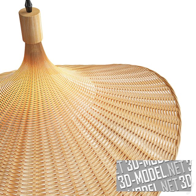 Подвесной светильник с широким абажуром из ротанга. Диаметр светильника - 80см. Абажур выполнен в виде криволинейного сужающегося зонта с плавно искривленной кромкой. Вершина шляпки - небольшой деревянный цилиндр, в котором смонтирован патрон с лампой.