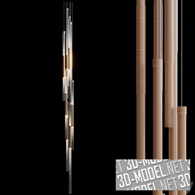 Стильный подвесной светильник от Vargov Design. Конструкция светильника выполнена в виде группы тонких длинных цилиндров на полупрозрачных нитях подвесов. Цилиндры скомбинированы из стекла и золотистого металла. На стекло нанесены горизонтальные царапины с разной плотностью, преломляющие свет и создающие декоративный эффект. Светильник хорошо будет смотреться над лестничными маршами, в помещениях с высокими потолками или в локальных подсветках с низким размещением.