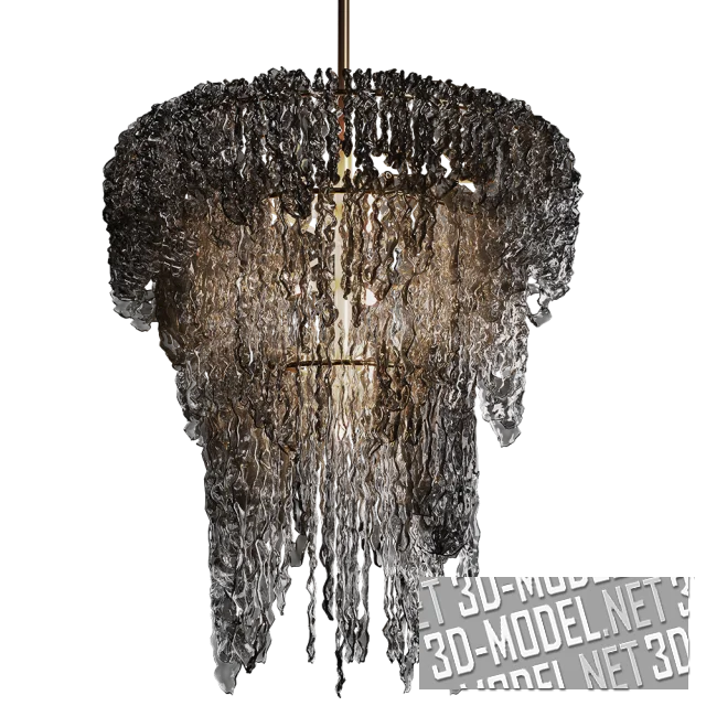 Крупная люстра в современном стиле - модель BLACK SPACE BIG. На латунной вертикальной штанге смонтированы три золотистых металлических кольца и патроны с лампами. На кольца каркаса навешаны каскады неповторяющихся элементов из дымчатого стекла ручной работы, создающих в массе объект, напоминающий замерзшие водоросли. Габарит светильника: 90х90х100см.