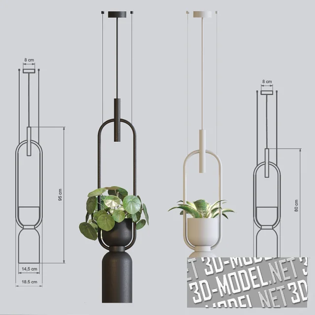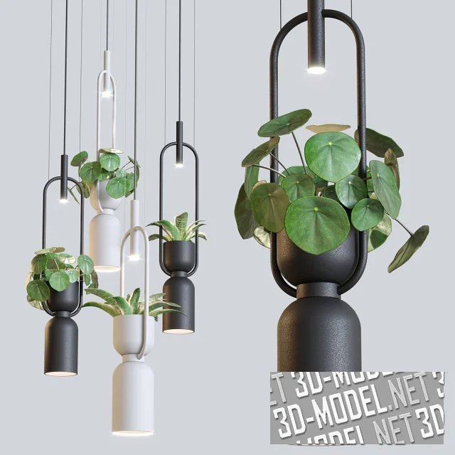 Современные подвесные металлические светильники из коллекции OXYGEN от luxcambra, скомбинированные с самополивающимся цветочным горшком с растением. На свесе смонтирован узкий цилиндр со светодиодным источником освещения в нижнем торце и овальный тонкий элемент, на который закреплен горшок с цветком. В нижней части гармонично смонтирован рефлектор с основной лампой. Представлены изделия в двух цветах (черного и белого) и двух высотах при одинаковом диаметре (d18,5(14,5)см/h95 или h80см). В горшках цветы двух видов: пилея и сансевиерия лауренти трехполосная карликовая.