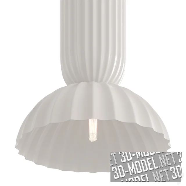 Современный потолочный подвесной светильник белого цвета Fluted White Porcelain Dome от cb2. Чашка, прикрывающая потолочный крепеж и купол плафона с «перетянутым» цилиндром декорированы рельефным гофрированием. Длинная трубка с кабелем внутри соединяет оба элемента.