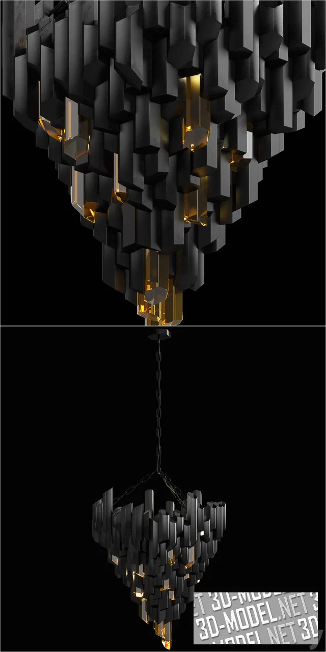 Крупный подвесной светильник от Michael Yeung. Люстра из металлических черных отрезков сотовых шестигранных труб, собранных в «гроздь», подвешенную на мощную цепь черного цвета. Источники света размещены за несколькими редкими шестигранными вставками в виде стеклянных кристаллов желтого оттенка. Брутальный светильник имеет габарит h120хd88см.