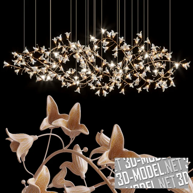 Изящный потолочный подвесной светильник Interflow, созданный в коллаборации Vargov Design и Sharon Marston. Каркас светильника, выполненный из тонкой золотистой металлической трубки, изящно изогнутой в объемную конструкцию, подвешен на множество тонких тросов. На трубке во множестве закреплены белые стеклянные трехлепестковые цветки с лампочками внутри и белые стеклянные бусины на небольших золотистых ветках.