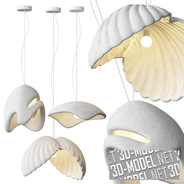 Три подвесных светильника из легкой полимерной смолы и полистирола Wabi Sabi Resin от Dekorfine. Криволинейные, бионических форм абажуры светильников белого цвета, с текстурой бетона на поверхности. Патрон на одну лампочку с белым матовым шариком колбы. Белая, рельефная, текстурированная поверхность плафонов отлично рассеивает свет, создавая интересные свето-теневые рисунки. Элементы интерьера в японском стиле Ваби-саби отлично вписываются в сканди-стиль. Три варианта плафонов отдаленно напоминают колокол, шляпку гриба и раскрытую раковину-жемчужницу.