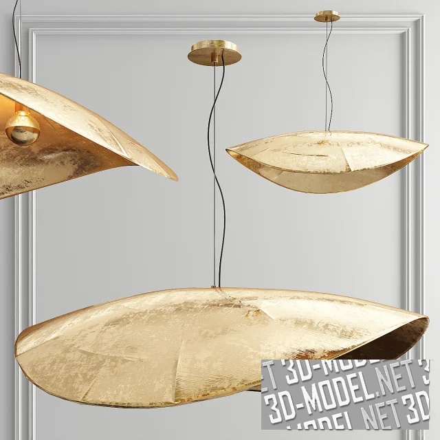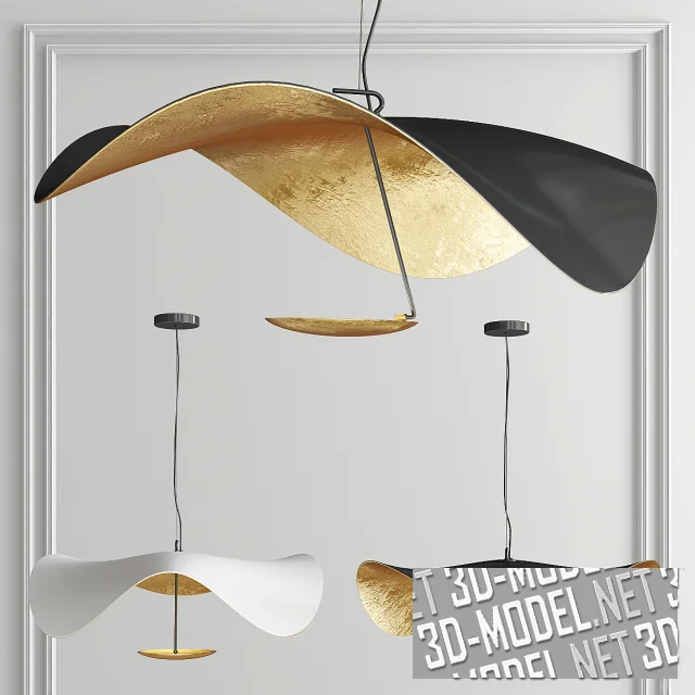 Современные подвесные светильники в черно-золотом сочетании. В коллекции четыре варианта. Первый: Gervasoni Brass с согнутым круглым абажуром (d80см), декорированным золотой поталью. Корпус второго светильника (Soleil Noir от Luce Plan) выполнен в виде черного криволинейного силуэта, напоминающего авокадо в разрезе, с черной круглой «косточкой» на белом фоне внутренней поверхности рефлектора. Габарит абажура второго светильника: 120х62,5х35,3см. Длина с подвесом - 45-320см.