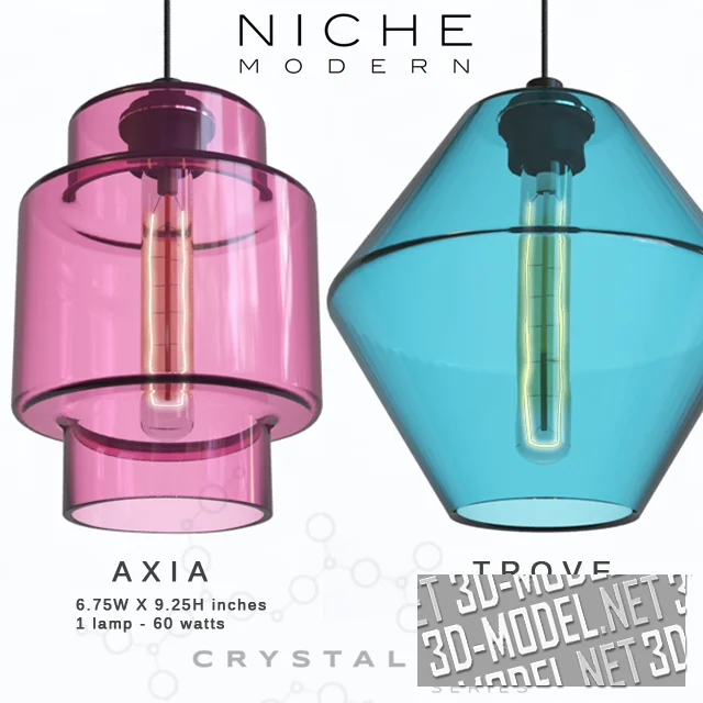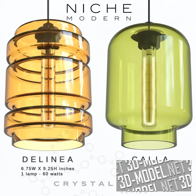 Небольшая коллекция современных подвесных светильников из цветного стекла - серия Crystalline от студии Niche Modern (дизайнер: Jeremy Pyles). Представлено четыре модели: Calla (d17,15/h23,5см), Delinea (d17,15/h23,5см), Axia (d17,15/h23,5см), Trove (d24,76/h23,5см), отличающиеся формой плафона и его цветом (лимонный, медовый, розовый, голубой).