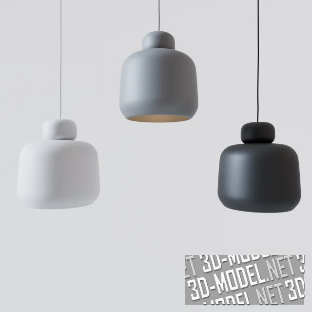 Небольшая коллекция современных подвесных светильников от WOUD (Дания). В наборе четыре варианта: Annular (с конусообразным толстостенным плафоном d46,8/h32,4см в четырех матовых цветах (светлый тиффани, нюдовый, белый, графит)); Dot (светильник в виде желудя с черной или белой шляпкой, d12/h16,6см); Stone-Smoll (d15,9/h16см) и Stone-large-black (d24/h24,6см) со скругленными двухсоставными (большим снизу и маленьким сверху) плафонами (черный, серый, белый). Максимальная длина шнура - 3м. Светильники хорошо смотрятся по одному и в группах из одного артикула.