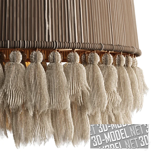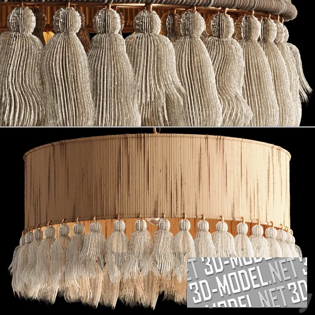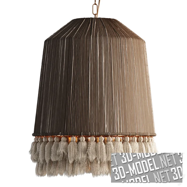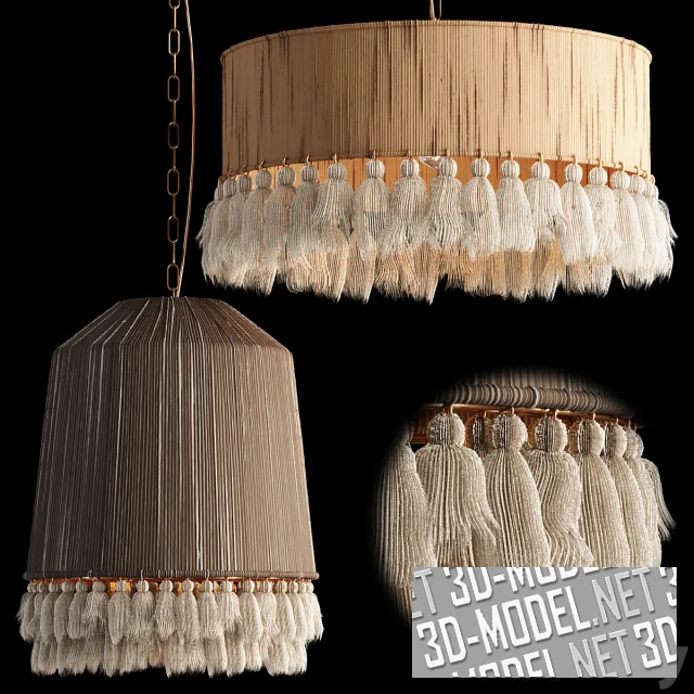 Представлено два варианта подвеса: круглый с большим и невысоким цилиндрическим абажуром (с бледно-желтым шнуром обмотки, d60/h27см, с одним рядом кистей на нижней кромке) и высокий, зауживающийся кверху, с «переломленной» плоскостью (со светло-коричневым шнуром, d40/h47см, с двумя рядами кистей по нижней кромке).