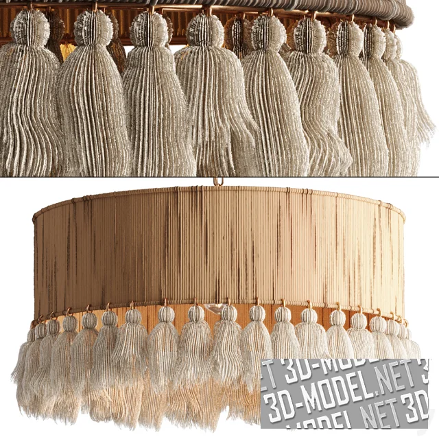 Круглые подвесные светильники Boho Rara. Конструкция абажуров, подвешиваемых на золотистой цепочке, состоит из проволочного каркаса, оплетенного мягким шнуром, формирующим боковую плоскость. По нижней кромке к абажурам прикреплены декоративные мягкие нитяные кисти, создающие колоритную бахрому.