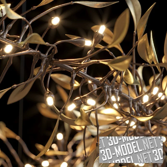 Современный подвесной светильник Olive от Vargov Design. Конструкция представляет собой криволинейное кольцо, собранное из металлических ветвей и листьев оливкового дерева золотистого цвета. Среди листьев проглядывает много мелких лампочек. Люстра висит на тонких подвесах.