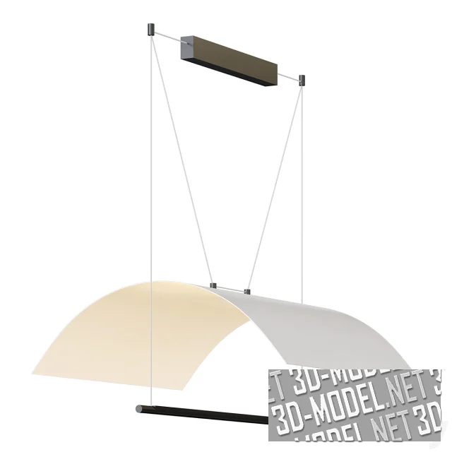 Элегантный подвесной светильник в минималистичном стиле - Lamina Mayor от испанского дизайнера Antoni Arola для Santa & Cole. Рефлектор выполнен в виде большого прямоугольного листа, изогнутого в легкую арку и подвешенного на систему из тонких черных тросов. На паре самых длинных тросов из этой системы смонтирована горизонтальная черная трубка с источником света, поток которого направлен вверх, на нижнюю, белую плоскость рефлектора.