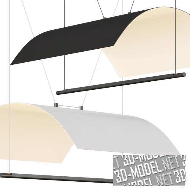 Представлены два варианта: с черными тросами и черной верхней плоскостью рефлектора и с полностью белым рефлектором и белыми тросами. Припотолочное основание - черный горизонтальный брусок с отделенными небольшими цилиндрическими элементами. Габарит светильника: 35х98,7х80см