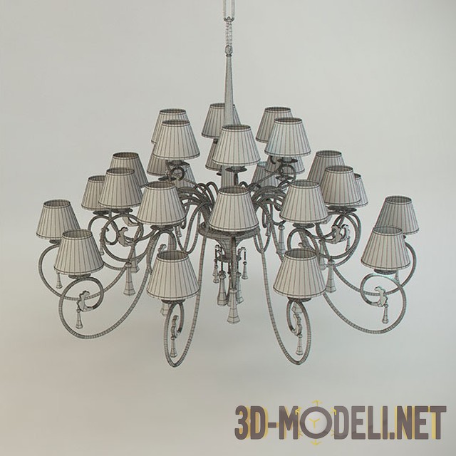 3d-модель роскошной потолочной люстры с золотым основанием и текстильными плафонами. Изящные золоченые завитки украшены темными декоративными подвесками, что создает волнительный контраст и придает люстре торжественности. Такой светильник подойдет для габаритных пространств с высокими потолками. Модель выглядит очень реалистично, имеет хорошую сетку и текстуры.