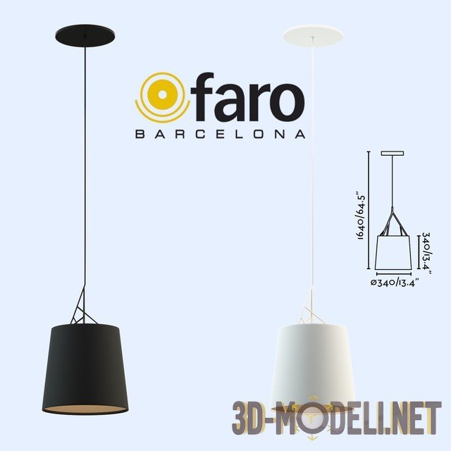 3D-модель современных подвесных светильников, черного и белого цвета, из коллекции Tree, от производителя Faro, Испания. Основание сделано из металла, покрытие матовое, варианты цветов черный или белый. Абажур текстильный, лампа предусмотрена одна, тип цоколя Е27, мощность 60 Ватт. Диаметр светильника составляет 32 см, высота 164 см.