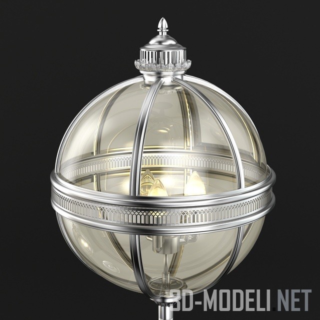 Модель этих светильников от Restoration Hardware навеяна газовыми фонарями викторианской эпохи. Большой напольный и маленький (настольный) светильники выполнены на хромированных столбах с шарообразными плафонами из прозрачного стекла. Стеклянные элементы плафона закреплены в декоративных перемычках сферического каркаса.