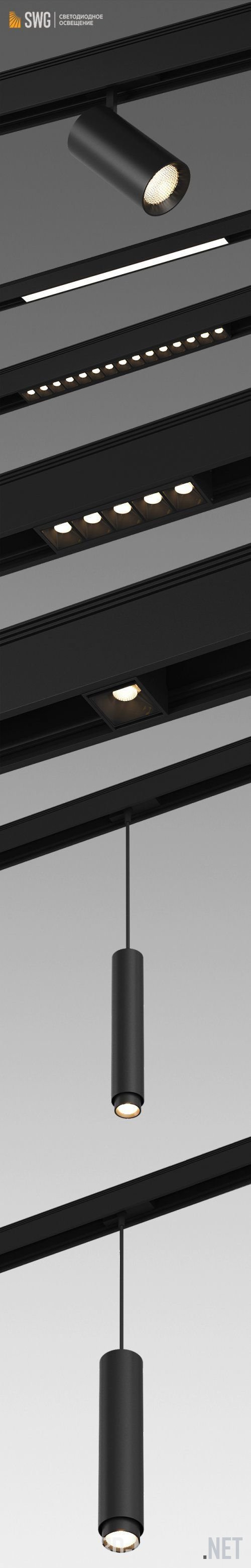 SWG представляет систему современных трековых светодиодных светильников из коллекции OM SY. Трековые профили и корпуса светильников выполнены в черном цвете. Источники света выполнены в виде встроенных в профиль светодиодов (от одинарного до сплошной ленты), а также в виде черных цилиндров с рассеивателем на торце, либо закрепленных к треку на шарнире, либо подвешенные на шнуре.