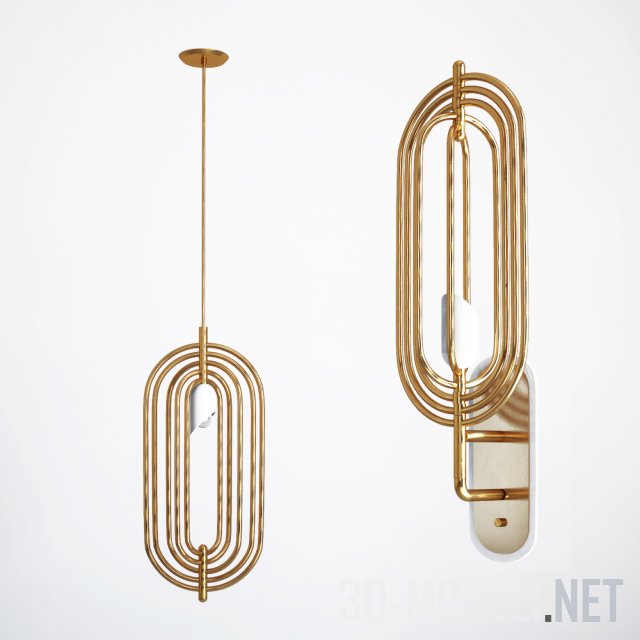 Комплект светильников Turner от Delightfull, потолочный и настенный варианты. Корпуса светильников выполнены в виде золотистого радиатора из пяти разновеликих овалов. Белые небольшие рефлекторы отлично вписываются в дизайн.
