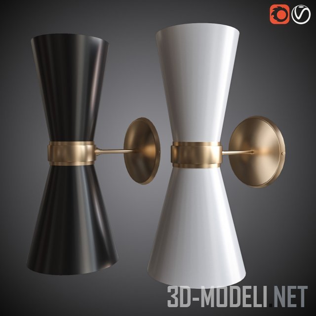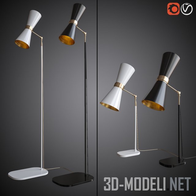 Комплект светильников (бра, торшеры и настольные светильники) MULLAN CAIRO. Изящные, минималистичные, на тонких ножках и рефлекторами в виде соединенных вершинами конусов, с белым или черным глянцевым покрытием, с золотистой внутренней поверхностью рефлекторов и золотистым кольцом «сжавшим» рефлекторы.