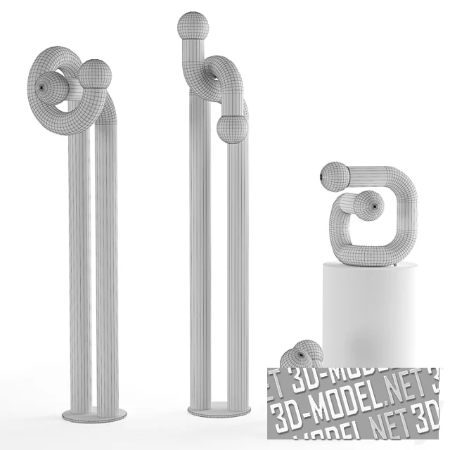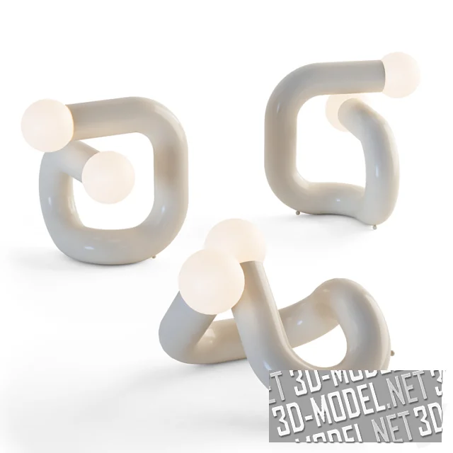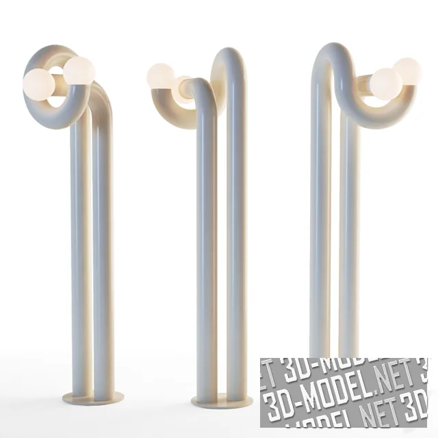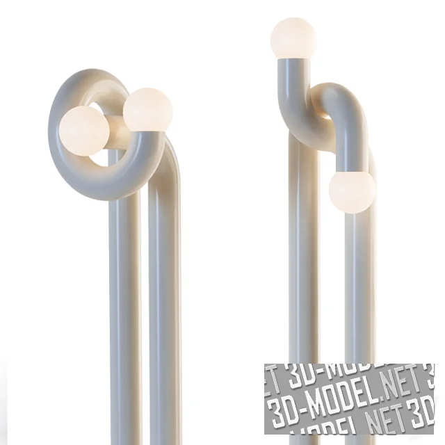 Небольшая коллекция современных светильников от Axel Chay. Конструкция выполнена на основе металлических труб, изогнутых в разных вариантах, с шарами плафонов из белого матового материала на концах. Представлено четыре модели из коллекции: две из напольной серии LAMPADAIRE MODULATION (в виде пары вертикальных труб с переплетенными изгибами и плафонами вверху) и две из настольной серии LAMPE SPHINX (в виде небольшого изогнутого отрезка трубы с плафонами на концах). Трубы данных моделей вскрыты белым лаком.