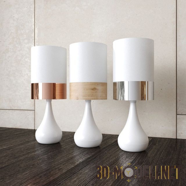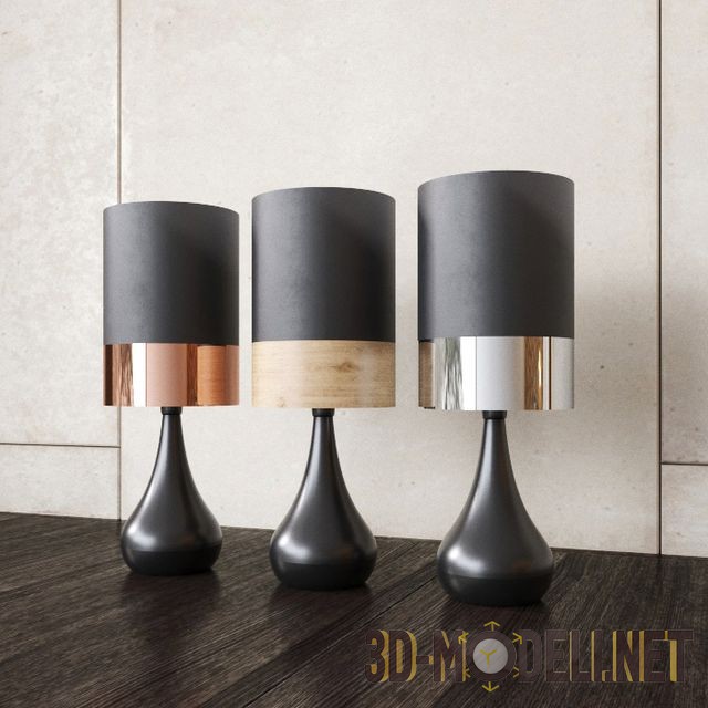 Современный настольный светильник Akira от Telbix, Австралия. На каплевидной ноге закреплён цилиндрический абажур. Представлено несколько вариантов декора: чёрные и белые, с разными вариантами декоративной полосы внизу абажура. Полосы трёх видов: красно–медная, хромированная и с текстурой светлого дерева. Высота светильника 41 см, диаметр абажура – 15 см.