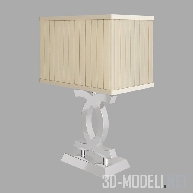 Симпатичный настольный светильник с прямоугольным пластинчатым абажуром бежевого цвета и белой плоской ножкой, выполненной в форме известного логотипа Chanel.