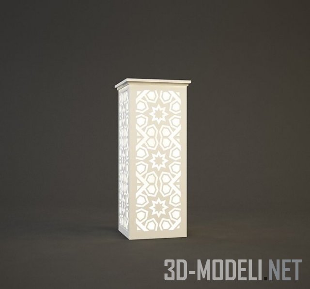 Элемент освещения, настольная лампа для различных поверхностей. Светильник отличается простотой и геометричностью формы, плоскости которой украшены восточным узором.