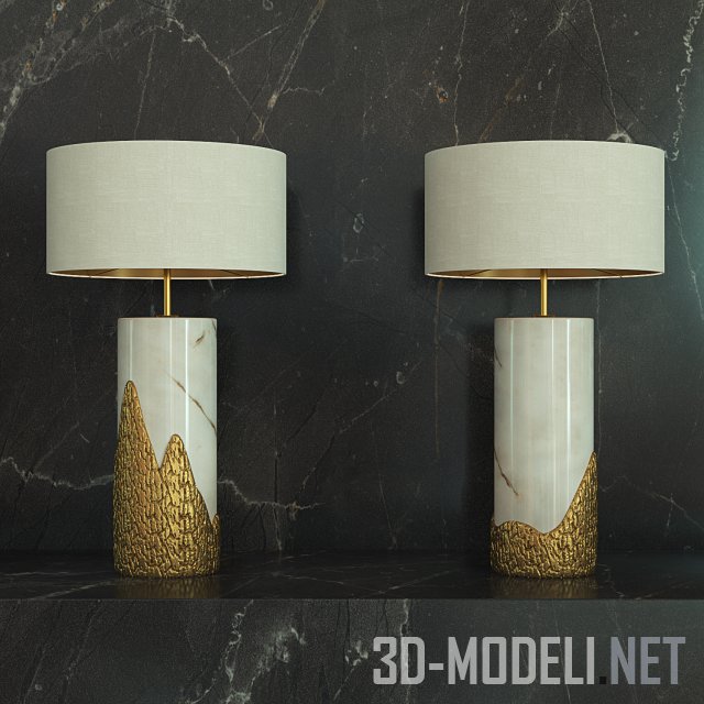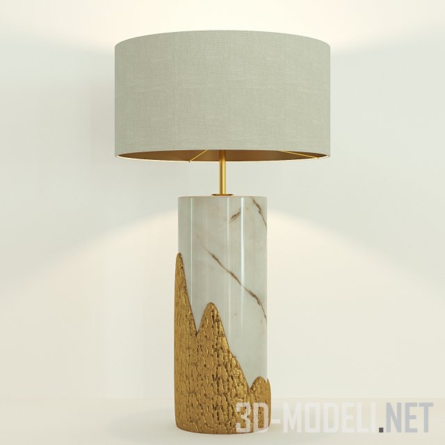 Настольная лампа Amber от Ginger and Jagger. Светильник сделан с белым основанием под мрамор, украшен золотым декором, который отлично сочетается с большим текстильным абажуром.